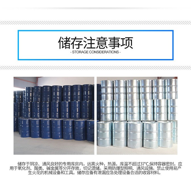 儲存于陰涼、通風的庫房。遠離火種、熱源。庫溫不宜超過29℃。包裝要求密封,不可與空氣接觸。應與氧化劑、酸類、堿類分開存放,切忌混儲。不宜大量儲存或久存。采用防爆型照明、通風設施。禁止使用易產生火花的機械設備和工具。儲區應備有泄漏應急處理設備和合適的收容材料。